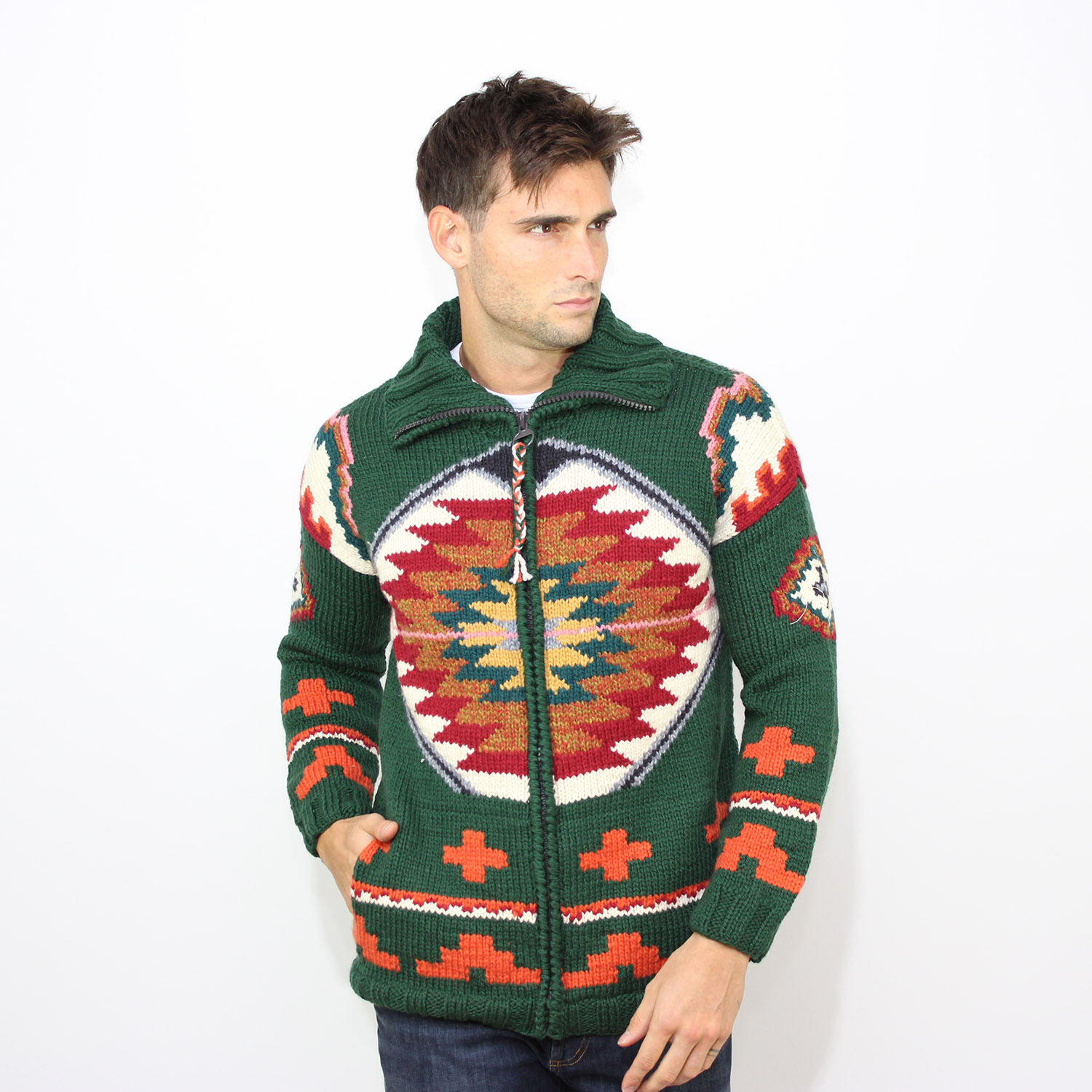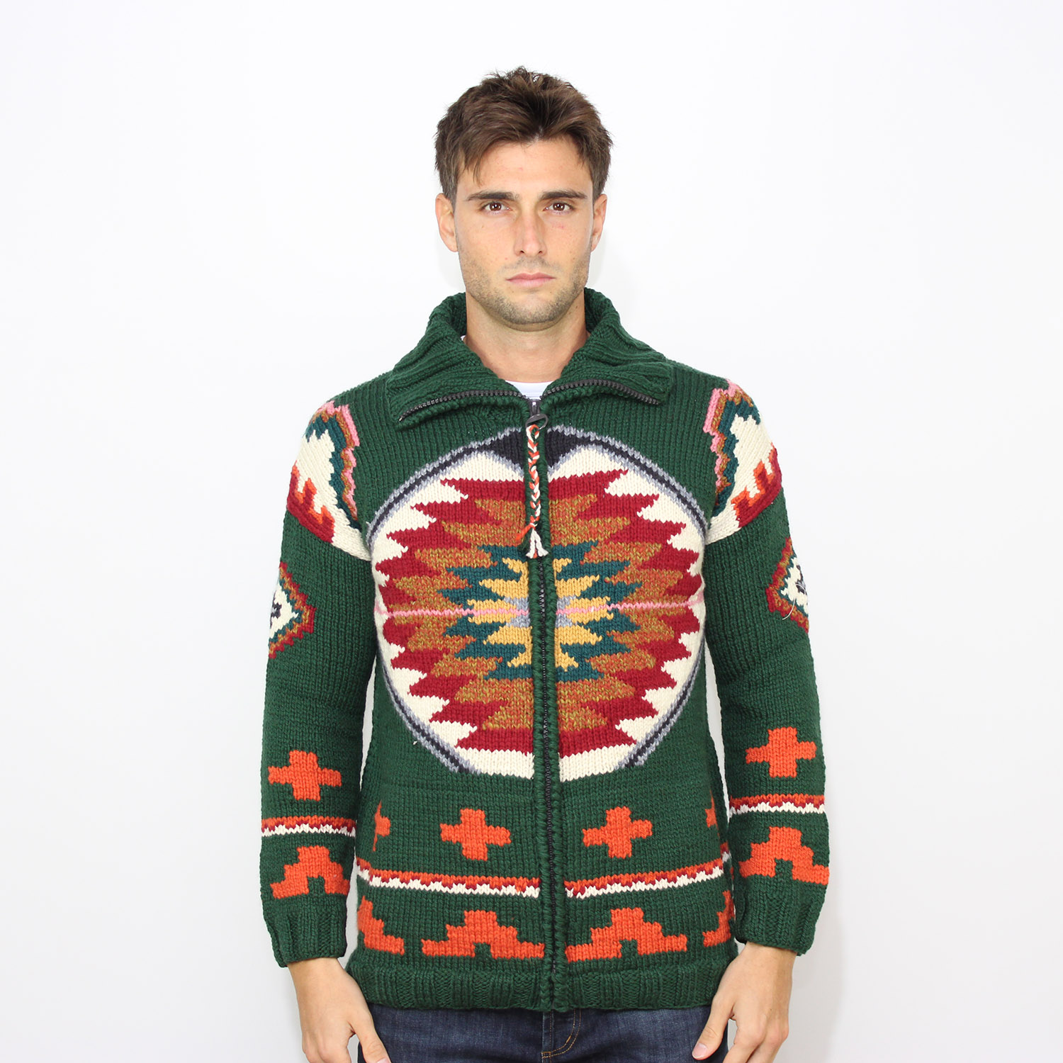 Giubbo collo alto fullzip in maglia lavorata a mano.