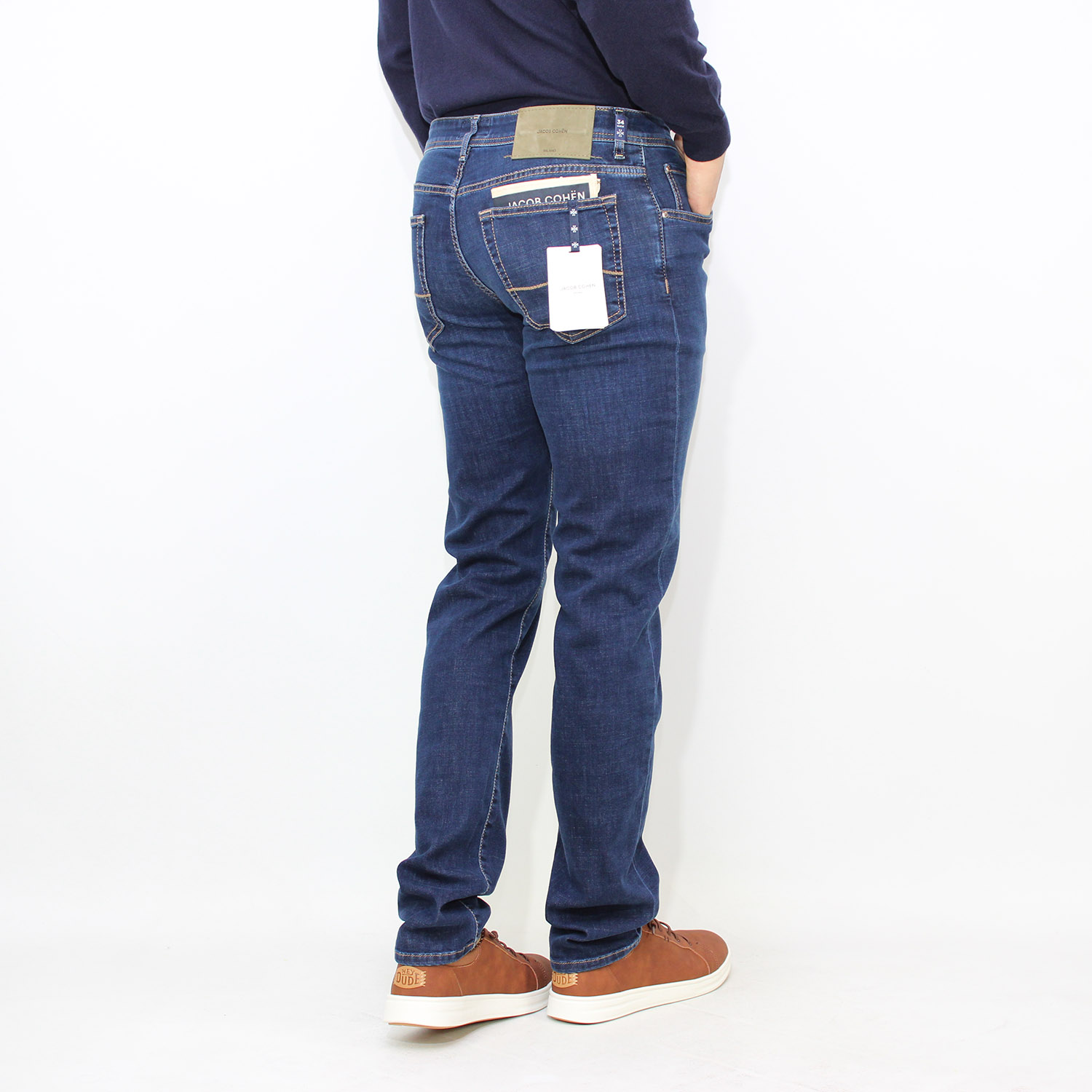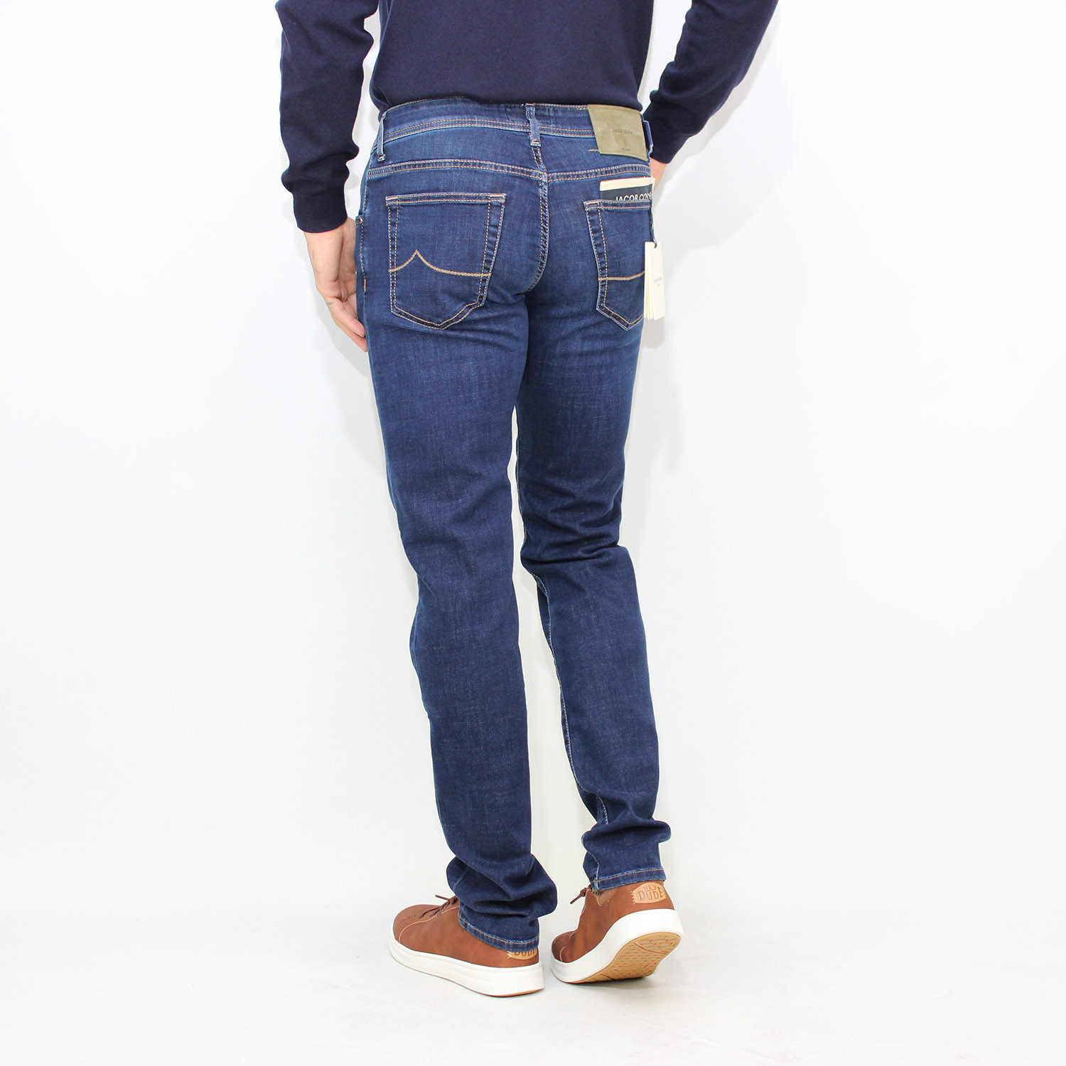 Denim indaco power stretch di cotone blu medio con lavaggio bleach, sabbiatura a mano e texture morbida.