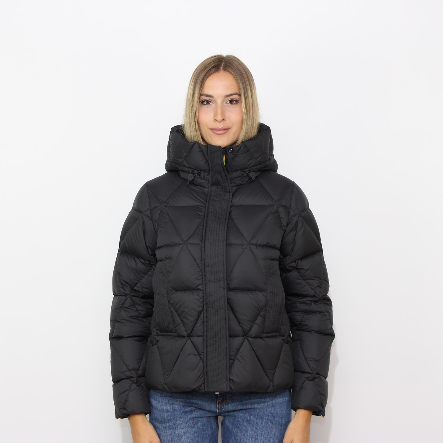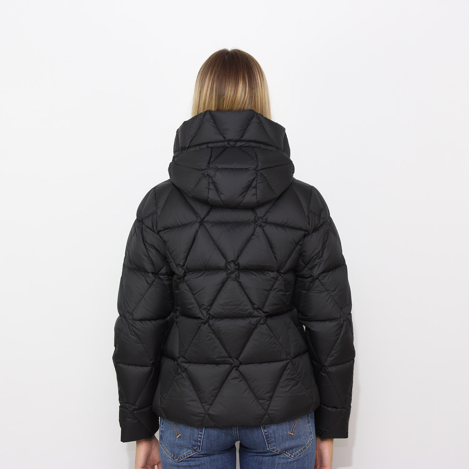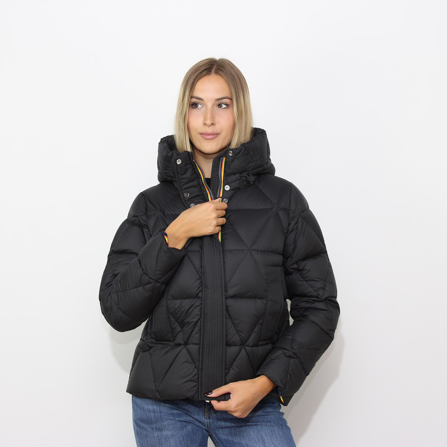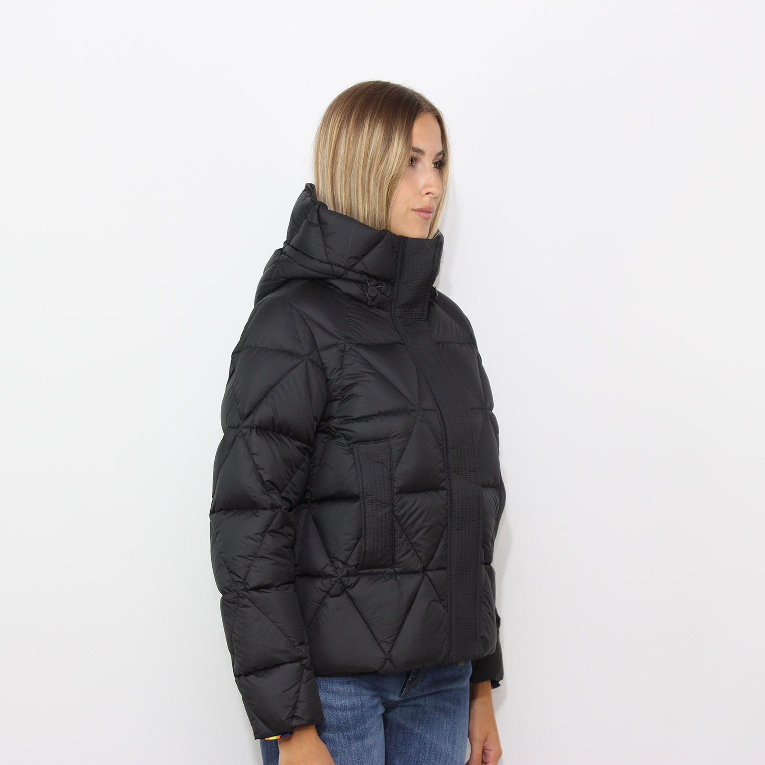 Piumino corto e imbottito da donna con un look cittadino.