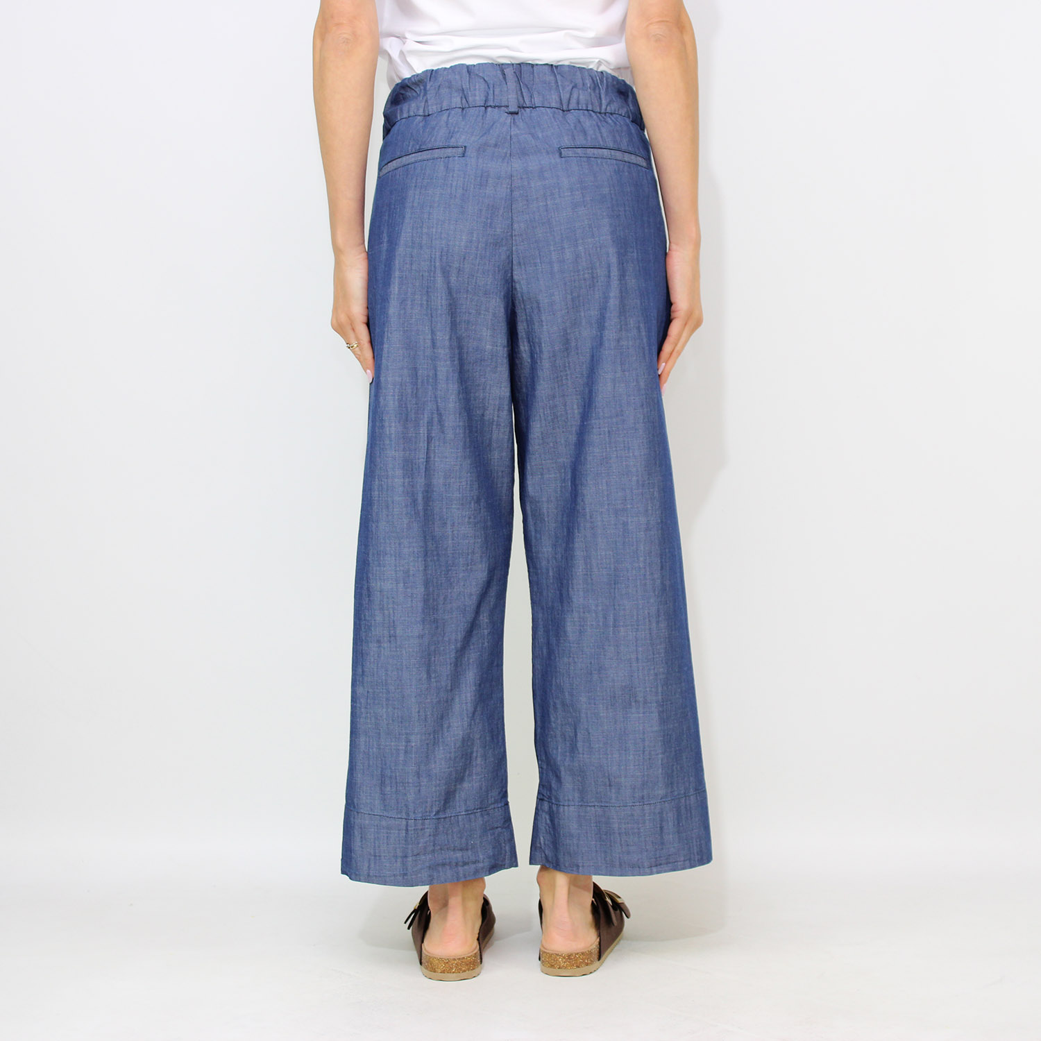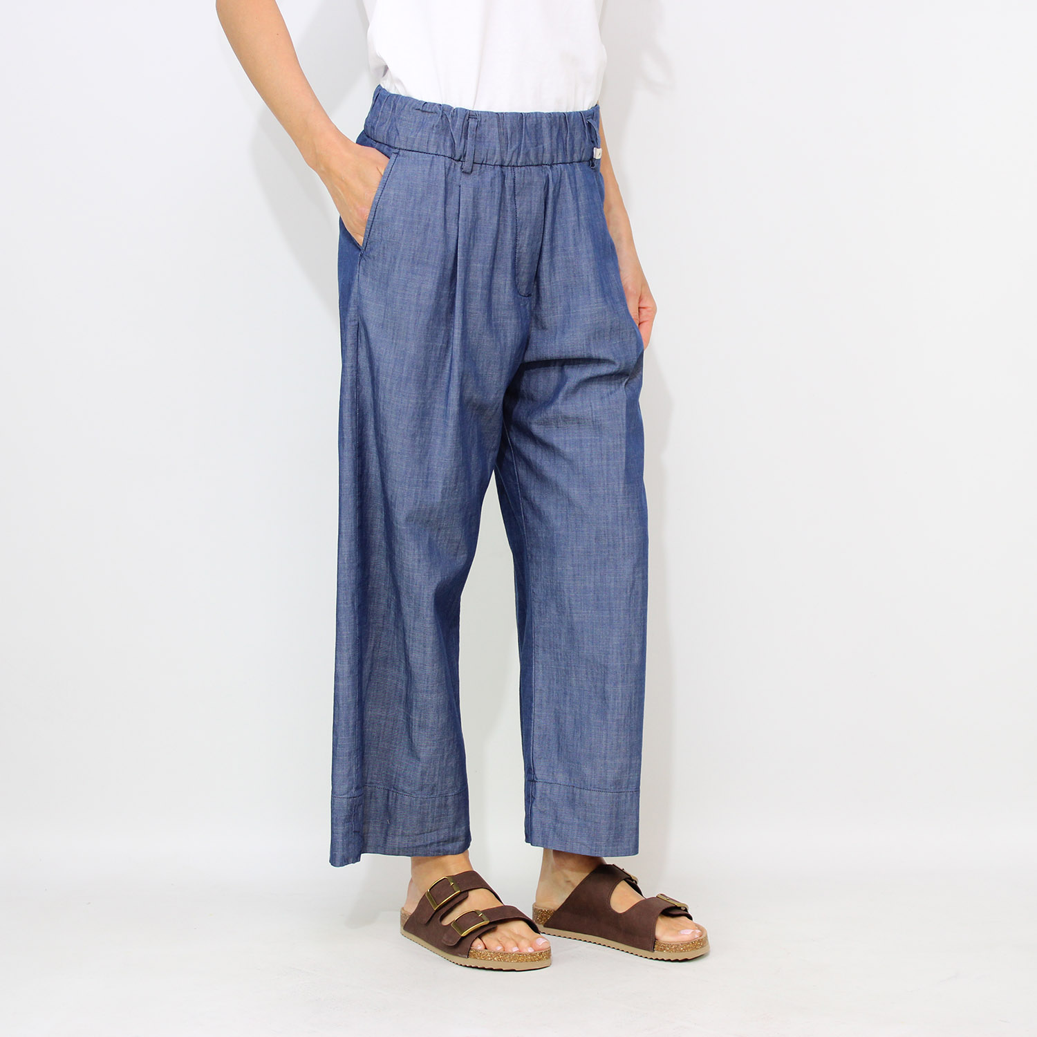 Pantalone con elastico in vita e pinces chambray lavaggio medio