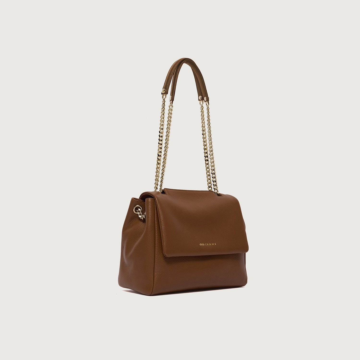 Modello a spalla e a tracolla in pelle martellata dalla grana sottile.