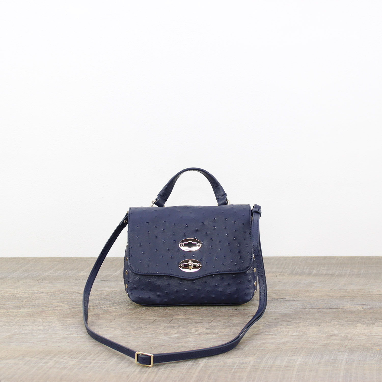 Può essere indossata a mano o a tracolla.